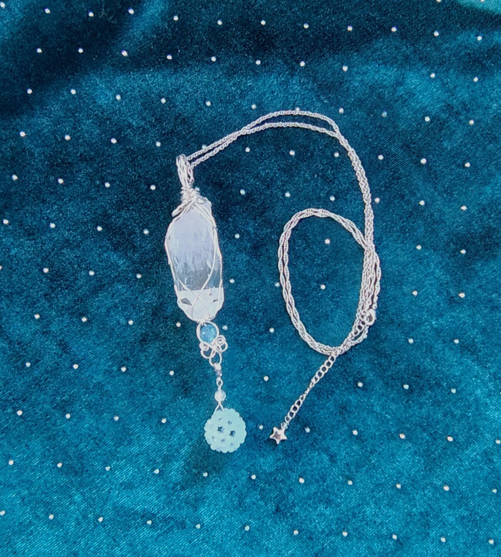 ♡下部に取り外しができるアクアマリン2.3㎜で編んだフラーレンチャームを付けました。